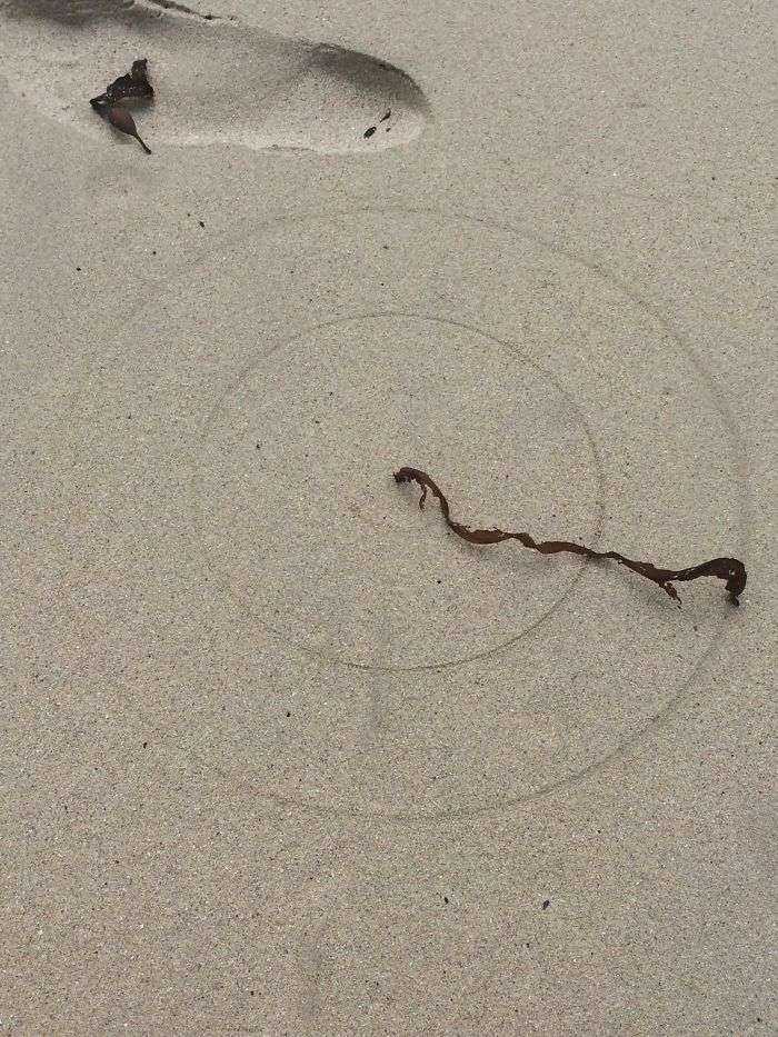 Esta alga seca atrapada en la arena dibujó círculos concentricos al ser rotada por el viento
