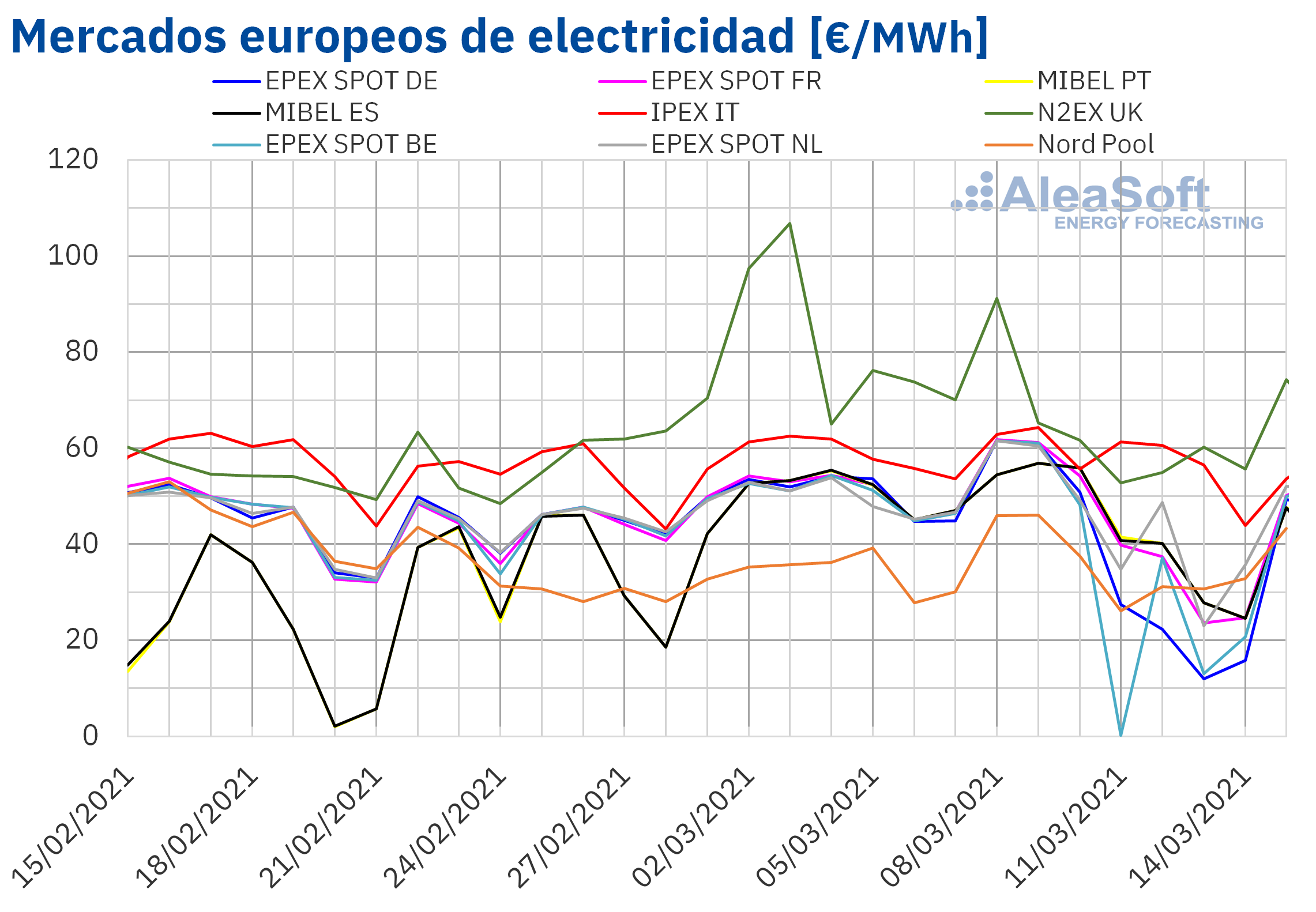 En la segunda semana de marzo, el precio promedio semanal más elevado fue el del mercado N2EX, de 63,09 €/MWh, seguido por el del mercado italiano, de 57,87 €/MWh. Mientras que en el mercado belga se registró el menor promedio, de 34,58 €/MWh. Promedios similares se alcanzaron en los mercados Nord Pool y alemán, de 35,76 €/MWh y 35,82 €/MWh, respectivamente. En el resto de los mercados, los precios se situaron entre los 42,91 €/MWh del mercado MIBEL de España y los 44,76 €/MWh del mercado de los Países Bajos.