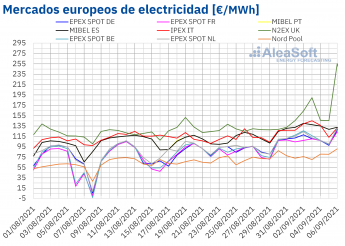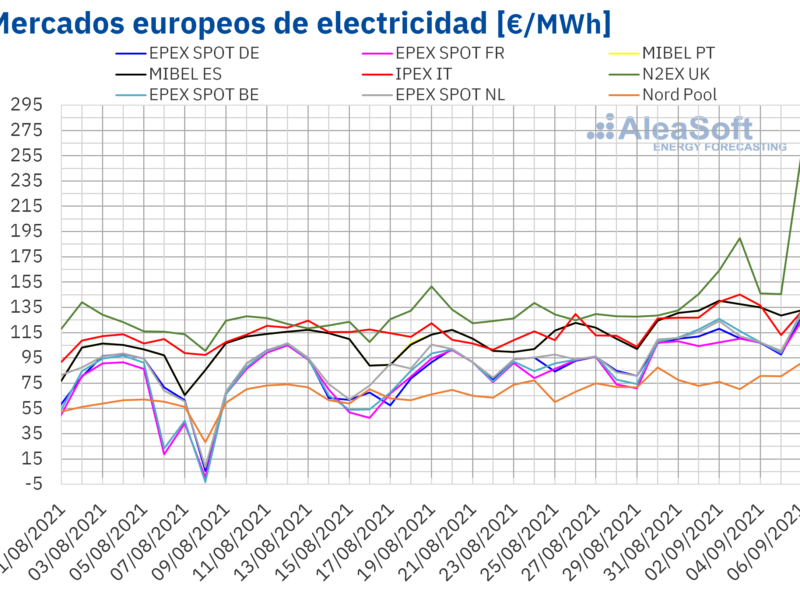 El lunes 6 de septiembre, se alcanzaron precios diarios récord en casi todos los mercados eléctricos analizados. Los precios de los mercados de Alemania, los países nórdicos, Francia y Bélgica alcanzaron los 127,82 €/MWh, los 90,91 €/MWh, los 123,98 €/MWh y los 131,39 €/MWh, respectivamente. Estos precios fueron los más altos desde octubre de 2008, febrero de 2012, noviembre de 2016 y noviembre de 2018, en cada mercado. En el caso del Reino Unido el precio diario, de 255,67 €/MWh, fue el más elevado al menos desde enero de 2010 y en el caso de los Países Bajos, de 129,30 €/MWh, al menos desde abril de 2011.