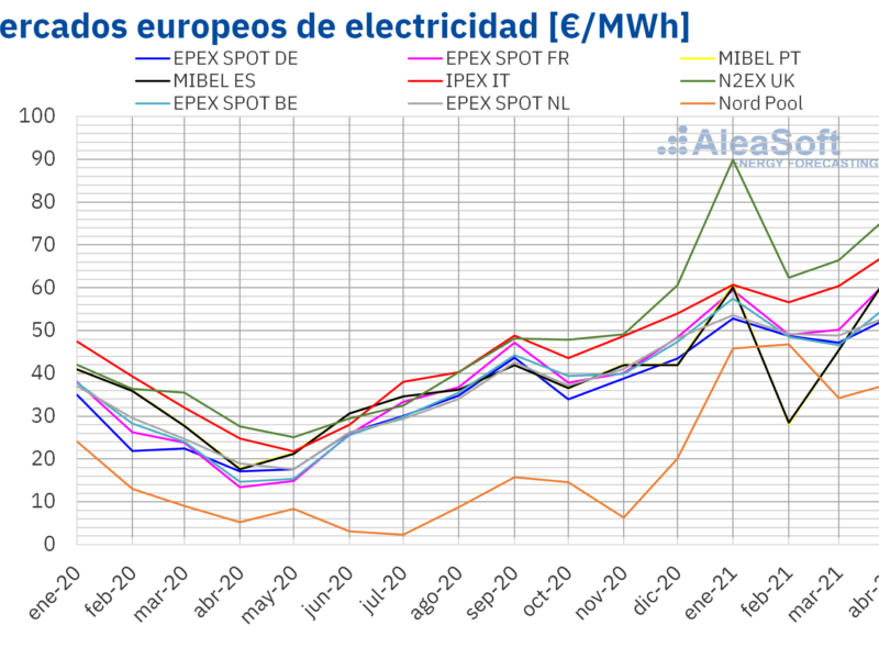 En el mes de abril de 2021, el precio promedio mensual estuvo por encima de los 50 €/MWh en casi todos los mercados eléctricos europeos analizados en AleaSoft. La excepción fue el mercado Nord Pool de los países nórdicos, con un promedio de 37,86 €/MWh. En cambio, el precio promedio mensual más elevado, de 77,96 €/MWh fue el del mercado N2EX del Reino Unido, seguido por el del mercado IPEX de Italia, de 69,02 €/MWh. En el resto de los mercados, los promedios estuvieron entre los 53,61 €/MWh del mercado EPEX SPOT de Alemania y los del mercado MIBEL, de 64,93 €/MWh en Portugal y 65,02 €/MWh en España.