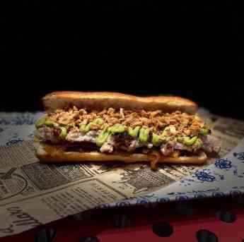 Mollete Kebab: Carne de cordero asada, Lima, Perejil, raselHanout, Pistachio, yogurt, Mahonesa, Cebolla tierna, Tomate, Dátiles, Rahin, Menta, Knorr jugo.