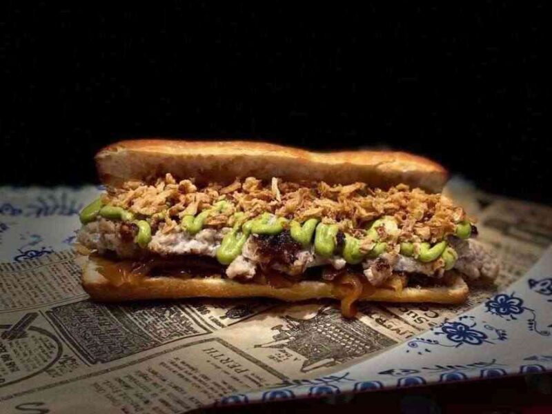Pepito:Roastbeef de solomillo, Jugo de carne, Paletilla de Ibérico, Mahonesa de garum, Ahumado (sal ahumada), Piparras frescas/Padrón Alcaparras.