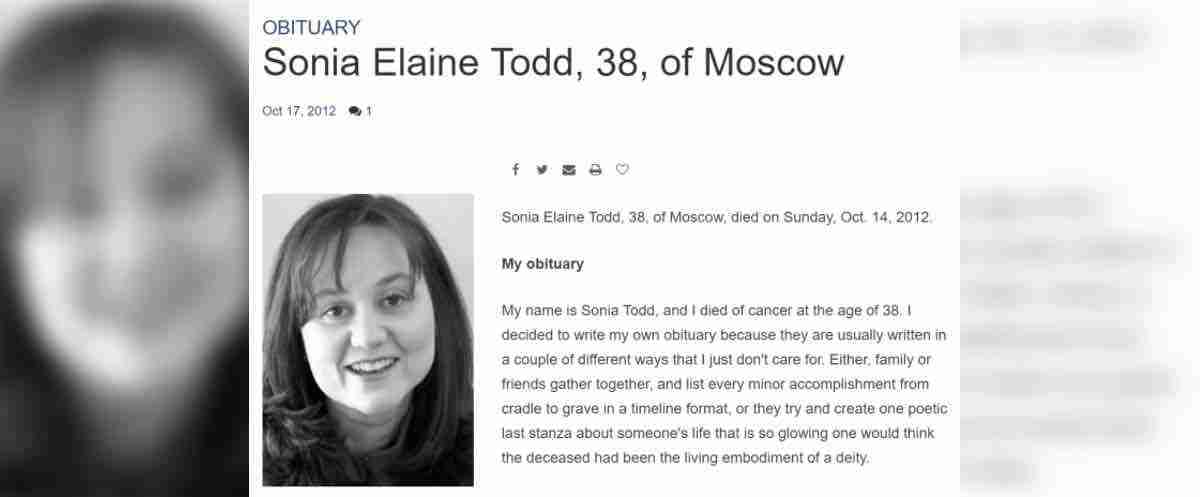 Sonia Elaine Todd. Una chica de 38 años proveniente de Rusia que jamás pensó que moriría a tan temprana edad. En esos momentos momentos uno se pregunta ¿Por qué a mi? ¿Qué hice para merecer esto? ¿Cómo se sentirá la muerte?. Cuando sabes que tu momento llegará pronto todo tu mundo…