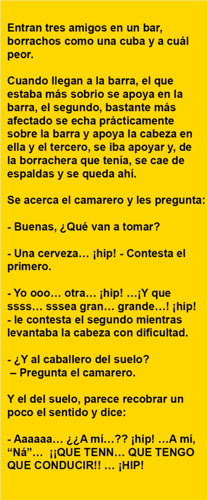 Entran tres amigos en un bar …Por Aldea Viral / 8 junio, 2017 Ahora puedes leer el artículo de Aldea Viral sobre Entran tres amigos en un bar …. Seguir leyendo artículo en AldeaViral.