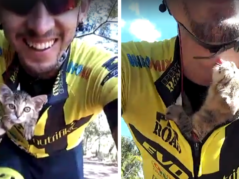 Hace unos días, el ciclista brasileño Viitor Fonseca estaba de paseo con su bici cuando vio a un gatito diminuto pidiendo ayuda. Vio que estaba claramente solo, y que era tan pequeño que no sería capaz de defenderse.