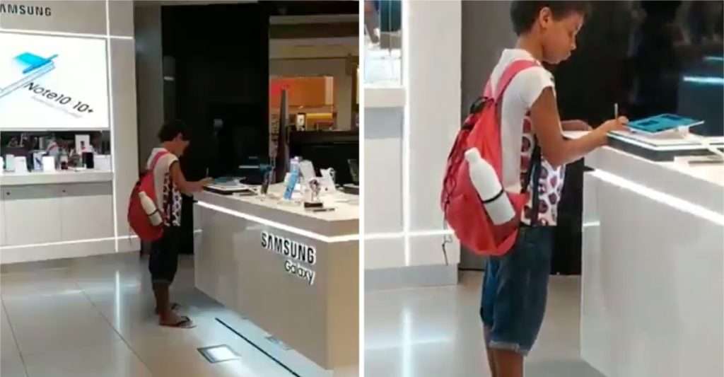 Ahora puedes leer el artículo de UpSocl sobre Flagraram uma criança usando um tablet de uma loja para fazer a lição de casa. Em sua casa ele não tem essas ferramentas.