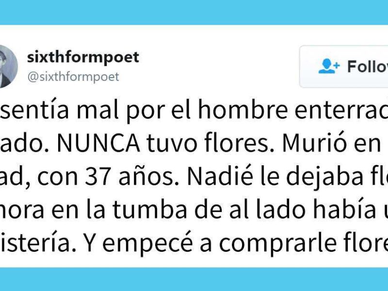 El amor nos llega de formas misterioras. Pero la historia de este hombre es tan divertida y retorcida, que tras tuitearla recibió 416000 likes. Matt, un tuitero que también se hace llamar Sixth Form Poet, visitaba la tumba de su padre y se dio cuenta de que la tumba de al lado nunca tenía…