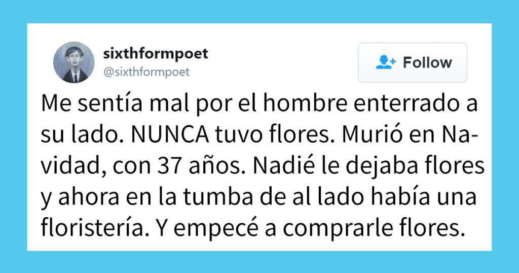 El amor nos llega de formas misterioras. Pero la historia de este hombre es tan divertida y retorcida, que tras tuitearla recibió 416000 likes. Matt, un tuitero que también se hace llamar Sixth Form Poet, visitaba la tumba de su padre y se dio cuenta de que la tumba de al lado nunca tenía…