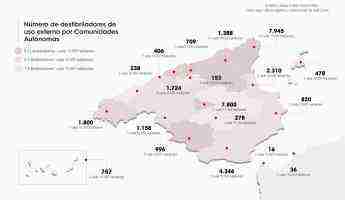 Tras Madrid aparece Navarra, con 709 desfibriladores, 11 por cada 10.000 habitantes. Con un ratio de 10 equipos por cada 10.000 habitantes aparecen Aragón (1.388) y Cataluña (7.945). Les siguen Extremadura, con 9 desfibriladores por cada 10.000 habitantes (996), País vasco con 8 equipos por cada 10.000 habitantes (1.724) y Galicia (1.800) y Cantabria (406) con 7 equipos por cada 10.000 habitantes. En el ratio de 5 desfibriladores por cada 10.000 habitantes se sitúan Andalucía (4.346), Castilla y León (1.158), La Rioja (153), la Comunidad Valenciana (2.310) y Murcia (820). La lista continua con Baleares (478) y Melilla (36), con 4 equipos cada 10.000 habitantes, Canarias (757) con 3 cada 10.000 habitantes y Principado de Asturias (238) y Ceuta (16), con 2 desfibriladores cada 10.000 habitantes.