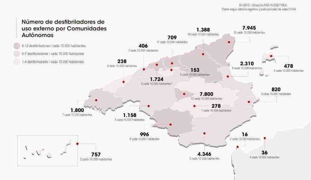 La cardioproteccion en España crece exponencialmente desde 2019. Dentro de nuestro territorio La Comunidad de Madrid lidera la cardioprotección en España con más de 7.800 desfibriladores instalados, 12 por cada 10.000 habitantes, según un estudio realizado por ALMAS INDUSTRIES B+SAFE, líder del mercado en soluciones de cardiprotección. En el extremo opuesto aparece Castilla La Mancha, con un total de 278 desfibriladores, 1 por cada 10.000 habitantes.