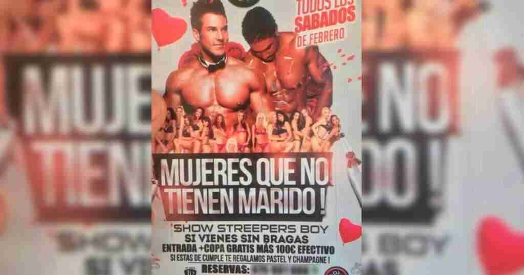 “Mujeres que no tienen marido“, comienza diciendo el cartel en el que podemos ver a dos maromos fornidos semidesnudos y, en un segundo plano, a un grupo de mujeres en ropa interior y actitud sugerente. Así lanzaba su más que polémica promoción la discoteca barcelonesa Bailódromo Caña…