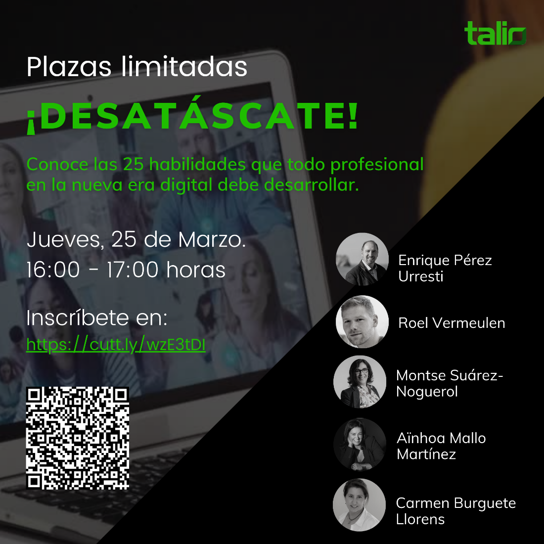 Por añadidura, invitan el próximo día 25 de marzo de las 16:00 a las 17:00 horas a asistir en el webinar que Talio desarrollará orientada a las habilidades y herramientas que se trabajarán en la formación. En este webinar los expertos responsables de impartir los cursos “Desatáscate” charlarán de forma dinámica sobre los retos a los que se enfrentan los profesionales de las organizaciones en esta nueva situación. Con ello, se realizarán actividades prácticas para que los participantes puedan conocer la dinámica de enseñanza que se plantea en esta formación.