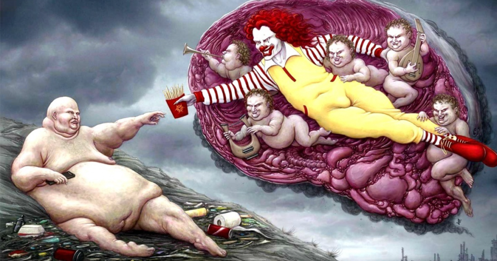 No es ningún secreto que nuestra sociedad tiene sus defectos: dependencia de la tecnología, impuestos, obesidad, la devaluación del trabajador… esos son solo unos pocos. Hay gente que no quiere ni pensar en esos problemas, pero el ilustrador John Holcroft hace exactamente lo contrario: los mira…