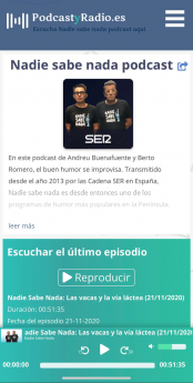 PodcastyRadio.es combina el contenido curado sobre podcast con un catálogo seleccionado manualmente y herramientas propias. Quienes visiten PodcastyRadio.es (www.podcastyradio.es) encontrarán información completa, única y actualizada sobre programas de todas las plataformas, incluyendo los exclusivos de Spotify, Podimo y Audible y las cadenas radiales tradicionales. Allí también pueden buscar por temas dentro de cada programa y reproducirlos, todo en un solo lugar. PodcastyRadio.es actualiza diariamente los rankings de popularidad y quienes lo visiten encontrarán herramientas exclusivas de búsqueda y contenido curado a la carta, que pueden escuchar de manera gratuita, sin necesidad de recurrir a otras aplicaciones.