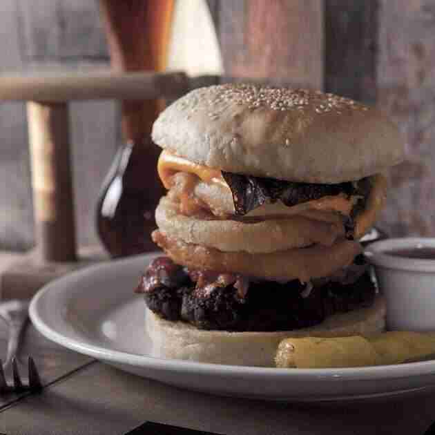 Una hamburguesa a la plancha acompañada por 200 gramos de tocino crocante, aros de cebolla en batido de cerveza, queso cheddar grillado y salsa golf al jim beam.
