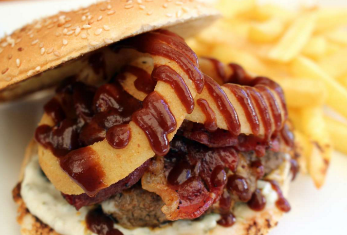 Una hamburguesa a la plancha acompañada por 200 gramos de tocino crocante, aros de cebolla en batido de cerveza, queso cheddar grillado y salsa golf al jim beam.