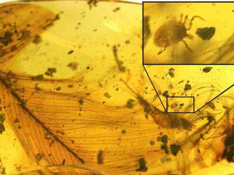 Uno de los cinco parásitos descubiertos en piezas de ámbar estaba enganchado en una pluma de reptil gigante y otro se había hinchado tras darse un festín.