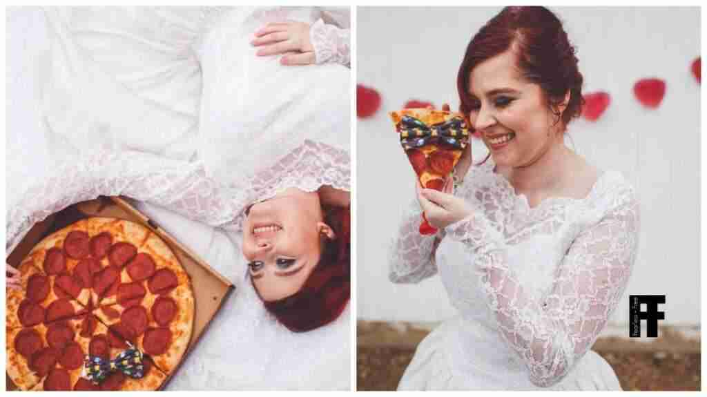 Ahh, el amor. Es tan tierno, tan dulce, lleno de buenos y malos momentos que te hacen recordar una y otra vez tu elección con esa persona especial. Pero esta mujer al parecer encontró el amor en otra persona… o comida, porque se puso un vestido de novia y se tomó la más divertida y cómica…